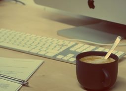 昏黄的灯光下办公桌面上放着一个台式笔记本脑以及一杯冲好的咖啡食物饮品素材设计