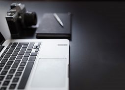 黑色的干净整洁的桌面上放置着一个笔记本一支笔等办公用品商务金融素材设计