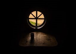 透过一个小的圆形窗户昏黄的阳光照射进来窗外的土地干旱建筑素材设计