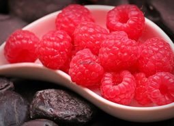 褐色石头平面上放置着白色的瓷质容器里面装着红色的树莓食物饮品素材设计