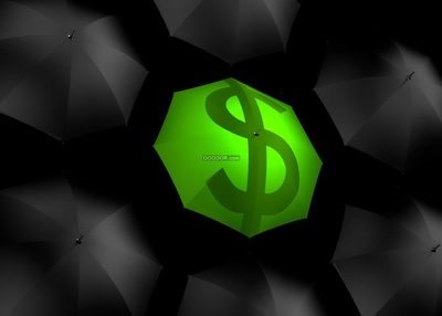 商业金融素材设计黑色背景下是几把雨伞中间的一把绿色雨伞上面印着绿色的美元标识
