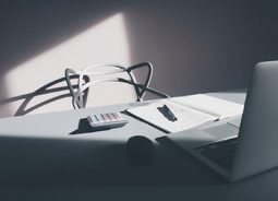 整洁的桌面上放着一个计算器一台笔记本电脑以及其他相关的办公室