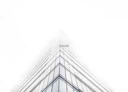 清晨时分天空下着浓浓的大雾一幢都市风格的白色建筑物高耸入云建筑素材设计