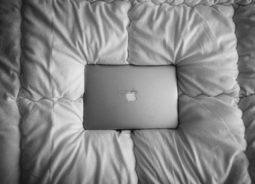 一台苹果笔记本电脑放置在铺平的棉被上面