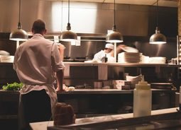 昏黄的灯光下特写高端餐厅厨房工作环境
