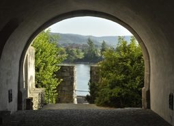 0透过拱门式建筑观赏恬静自然的夏季田园风景自然风景素材设计