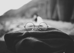 深褐色的毛巾上面放置着一个圆形框的女士眼镜背景花纹素材设计