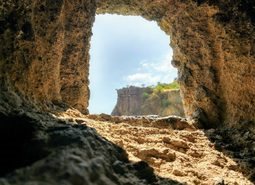 自然风景素材设计亚美尼亚的洞穴深处阳光照射进来透过洞口可以看见外面美丽的自然景观