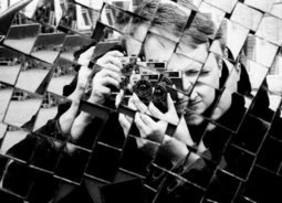 一块块玻璃拼接的墙壁上倒映着一个人正在摄像的影子人物素材设计