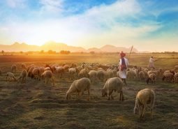 动物素材设计天空晴朗阳光明媚辽阔的草原上牧人驱赶赶着羊群