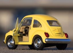 背景花纹素材设计一个黄色的卡通玩具汽车开着车门安静的摆放在地面上
