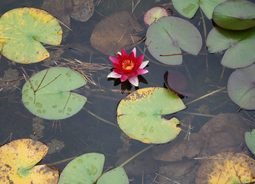 简陋的池塘几片圆圆的荷叶衬托着一朵绽放的粉色的荷花植物素材设计