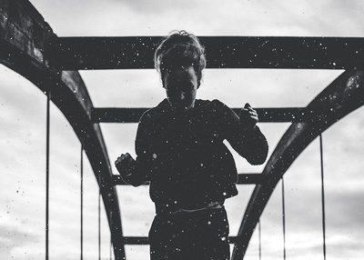 运动素材设计运动爱好者下雨天在户外的大桥上跑步健身