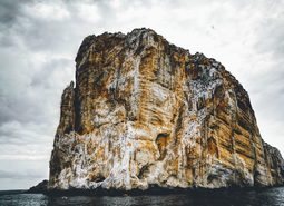 自然风景素材设计天气氤氲海岸边矗立着一座陡峭高耸的褐色山峰