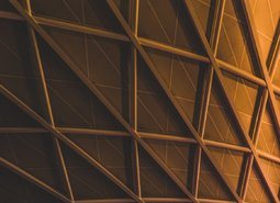 暖色调灯光散射在三脚架拼接的弧形钢铁建筑上