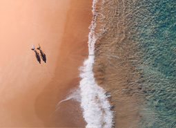 蓝色大海冲击着灰色沙漠在交界处溅起洁白的浪花