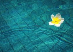 泳池内的水清澈碧绿水面上漂着一枚黄白色的花瓣植物素材设计