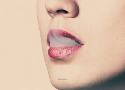 美妆时尚素材设计淡粉色背景下高清拍摄一位浓妆的女性嘴唇吐露着烟雾