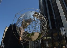 晴朗的天空下高楼林立直入云霄一个球形的金属网状地球立在杆子上面地点地标素材设计