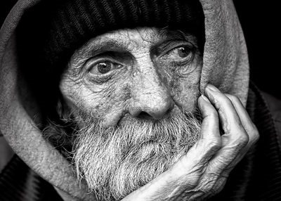 人物素材设计一位国外的老人面容憔悴眼神深邃拄着下巴思考问题
