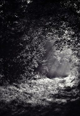 黑白特效清晨的阳光透过茂密的森林形成一道道亮丽的光柱照射在小路上