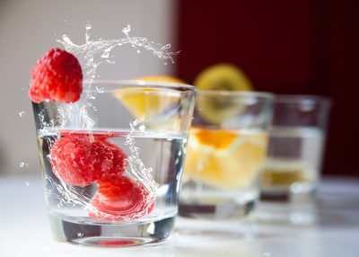 几颗草莓放进装着水的透明玻璃杯子里清新凉爽食物饮品素材设计