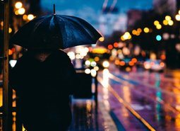 下雨天一个女生撑着雨伞走在灯火阑珊的街头