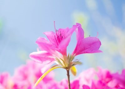 晴朗的天空下飘着几朵淡淡的云彩一朵粉色的花朵娇嫩欲滴努力绽放植物素材设计