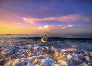 渔民在日出时分出海捕鱼天边的云彩被阳光照得金灿灿美丽壮观