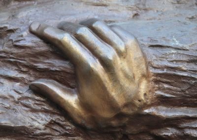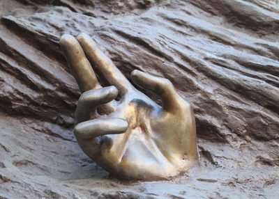 墙壁上雕刻着一个手型雕像首长扶着墙壁手背上散发着金属光泽