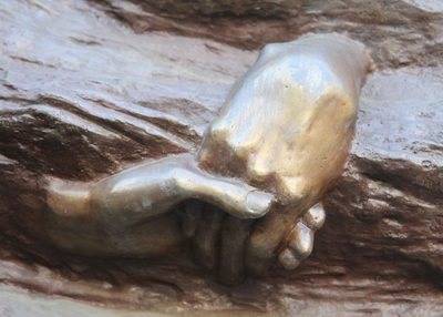 墙壁上雕刻着一个握手的艺术雕像象征着团结互助携手向前建筑素材设计