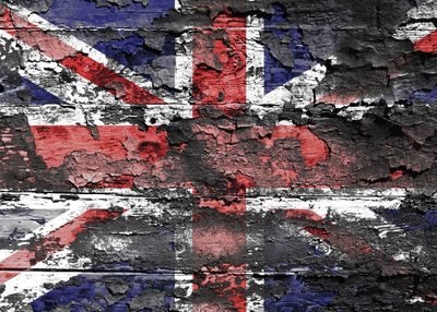木板墙上的英国国旗标志在一场大火之后被摧毁上面残存着燃烧过后的灰烬背景花纹素材设计