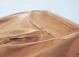两个人并肩行走在浩瀚荒芜的沙漠上