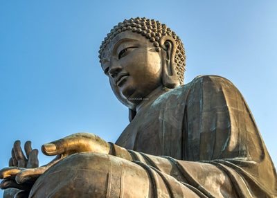 晴朗的天空下万里无云一尊面容慈祥大佛正在端坐着传授佛法宗教素材设计