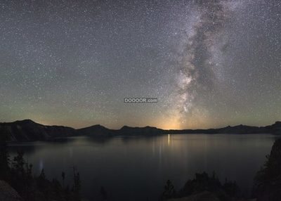 夜幕降临浩瀚的宇宙中群星点点平静的水面没有一丝涟漪自然风景素材设计