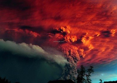火山爆发黑色和红色的云朵鸟儿四散奔逃压抑