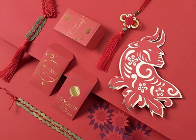 6款中国风新年中国红灯笼扇子金币产品展示台PSD模型-VOL-01
