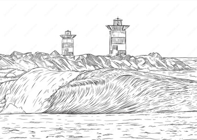 灯塔岩石岸边海浪地平线手绘素描矢量素材