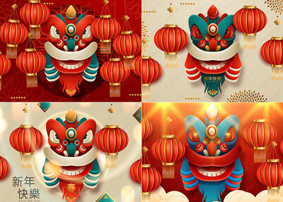 4款中国传统节日舞狮矢量狮头红灯笼素材