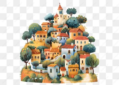 彩色插画小村庄景观