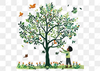 男孩在树下摘果子