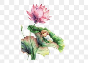 绿色的荷叶上面睡着一个小女孩卡通风格PNG素材