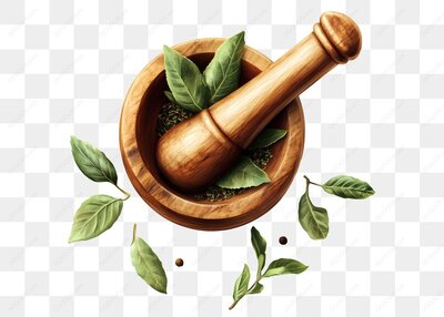 木质研钵搭配绿叶香料的自然疗法场景