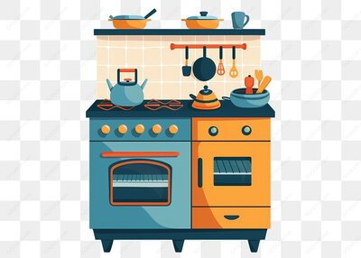 复古厨房蓝色灶台与多彩厨具的温馨场景