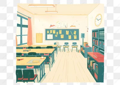 温馨教室里的书桌与书架场景