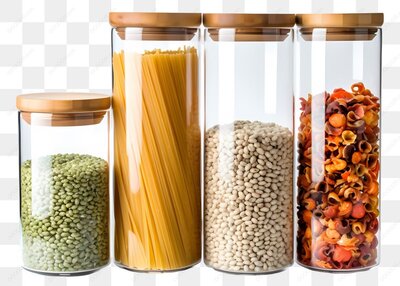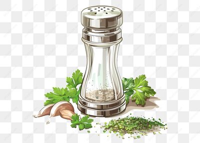 透明玻璃调料瓶搭配新鲜香草和大蒜