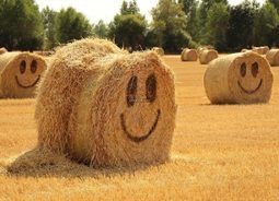 秋季收获的稻草卷成圆捆上面画着笑脸象征着收获的喜悦背景花纹素材设计